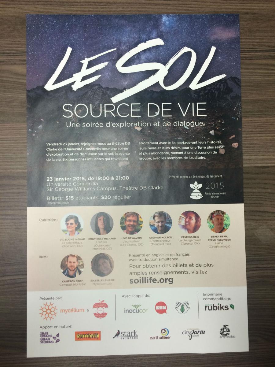 Nous encourageons la gestion responsable des matières résiduelles, et surtout le compostage sous toutes ses formes, par le biais de l'éducation - Compost Montréal propose des ateliers, formations et conférences dans le but de transmettre son expertise. Par exemple, pour célébrer 2015 en tant qu’Année internationale des sols, en janvier 2015 nous avons organisé une soirée de lancement avec six individus qui travaillent avec le sol de différentes manières (comme entrepreneur, artiste, militant, scientifique, autochtone, etc). Sol: Source de vie a attiré un auditoire de 250 personnes pour réflechir sur cet enjeu important.